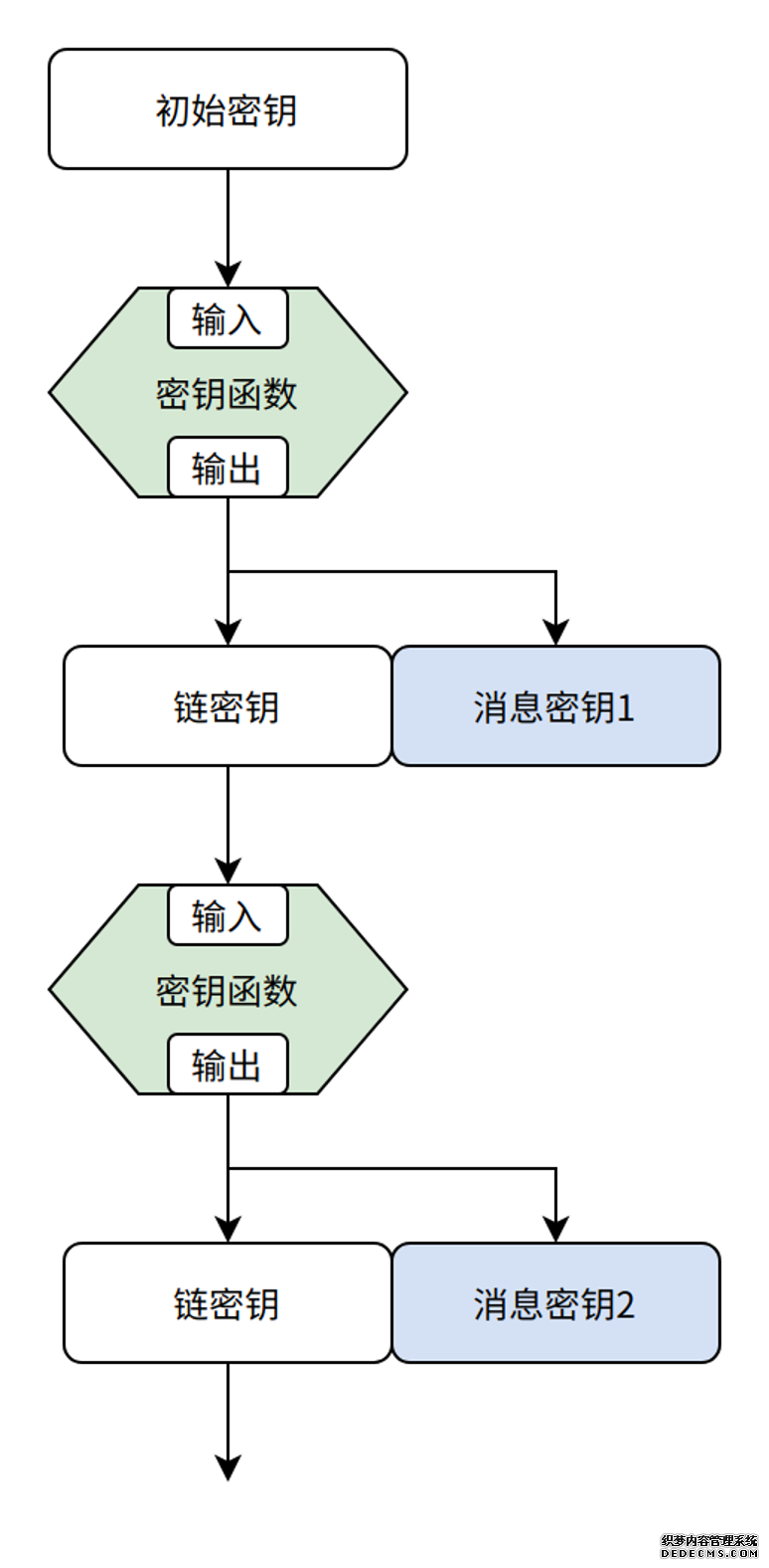 • 通过密钥函数计算得出消息密钥 • 密钥函数通常为不可逆函数,即知道输出很难反向计算出输入,比如大家熟知的哈希函数就是不可逆函数 • 密钥函数的输出被分为链密钥和消息密钥两部分,链密钥作为下一次密钥函数的输入,消息密钥用来加密消息 • 重复这个过程,即链式反应 链式反应生成的密钥虽然很安全,但带来一个新的问题,即如何读取历史消息。读取历史消息通常是从某条消息开始拉去 n 条消息。从上图可以看出,要想得到“消息密钥 2”,必须从初始密钥开始计算 2 次才能得出,如果要得到“消息密钥 10000”,则要计算 10000 次才能得出,显然这样做的效率非常低下。 推送 推送是 IM 业务里比较重要的功能,在 app 退到后台或者被杀死,仍然可以通知到客户。在去中心化 IM 架构中,因为消息是端到端加密的,节点在给 app 发送推送时,只有提醒“您有一条新消息”,不会有消息内容。这是在隐私保护与用户体验之间的妥协与平衡。 开源现状 目前在开源社区比较接近去中心化 IM 理念的产品 matrix。