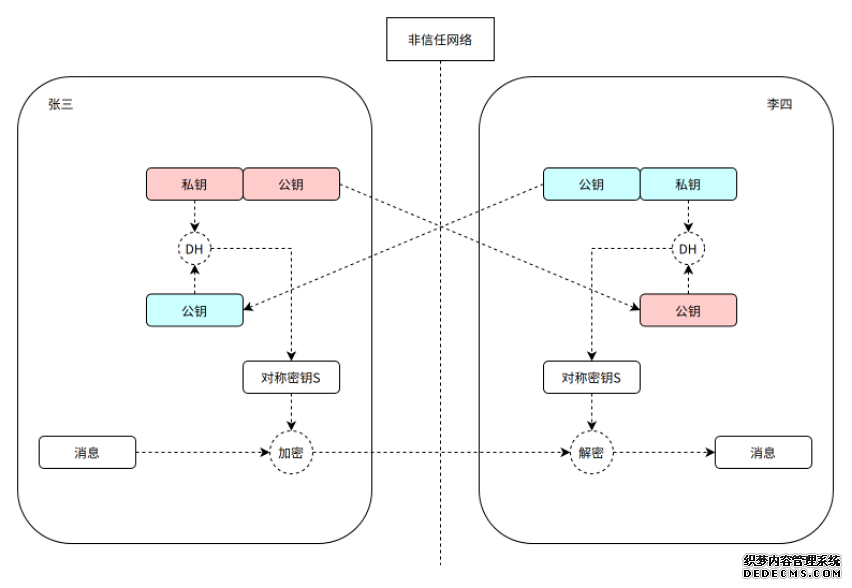 C 先收到 B 的消息,后收到 A 的消息,导致最终 C 的聊天记录和 A/B 的不一样。 解决方案: • 时间戳 每条消息都打上一个时间戳,在接收端根据时间戳排序。但是去中心化网络中,节点间的时钟不可能完全同步,仍然存在先后顺序错乱的可能性。 • 依赖消息 每条消息都带有依赖消息 Id,表示当前消息排在依赖消息之后。客户端在收到一条消息后,先检查其依赖消息是否都已经收到并且上屏,如果没有收到则先暂存消息,直到所有依赖消息上屏。此方案的缺点是增加客户端处理消息的复杂度。 端到端加密 因为任何人都可以加入去中心化 IM 网络,任何节点都可能接触到消息,所以为了隐私和安全,消息必须是端到端加密的。常用的端到端加密方案是 Diffie–Hellman 密钥交换协议(DH),可以使通讯双方无需预先沟通,在不安全的网络中即可确定一个“协商密钥”,这个密钥可以在后续的通讯中作为对称密钥来加密消息内容,这样避免了双方网上协商密钥带来的泄露风险。