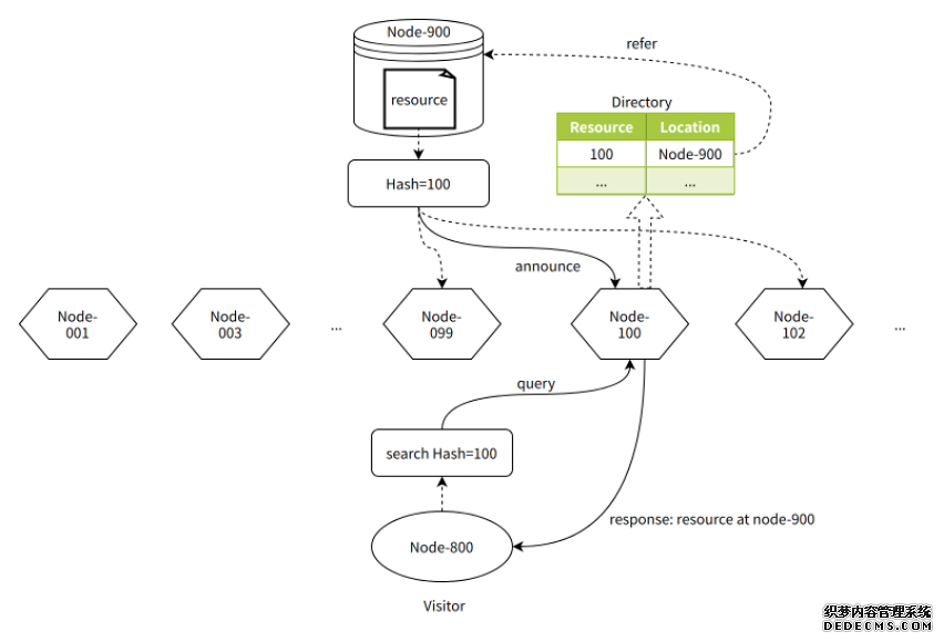 Gossip 的优点是对网络的连通性和稳定性几乎没有任何要求,具有极强的鲁棒性。缺点是网络中的消息太多,而且有重复消息,增加了网络传输压力和节点的额外处理负载。 Kademlia 网络 Kademlia 是一种分布式哈希表(DHT)技术,被广泛应用于去中心化产品中,比如大家熟知的以太坊,磁力下载等。Kademlia 把成千上万个节点构成一个自我组织的网络,用户可以使用这个网络快速查找定位到资源。关于 Kademlia 技术在网络上能找到很多相关文章,但大多数都拘泥于细节中,这里简单介绍 Kademlia 的原理,能解决什么问题,至于详细原理请自行搜索其他文章。