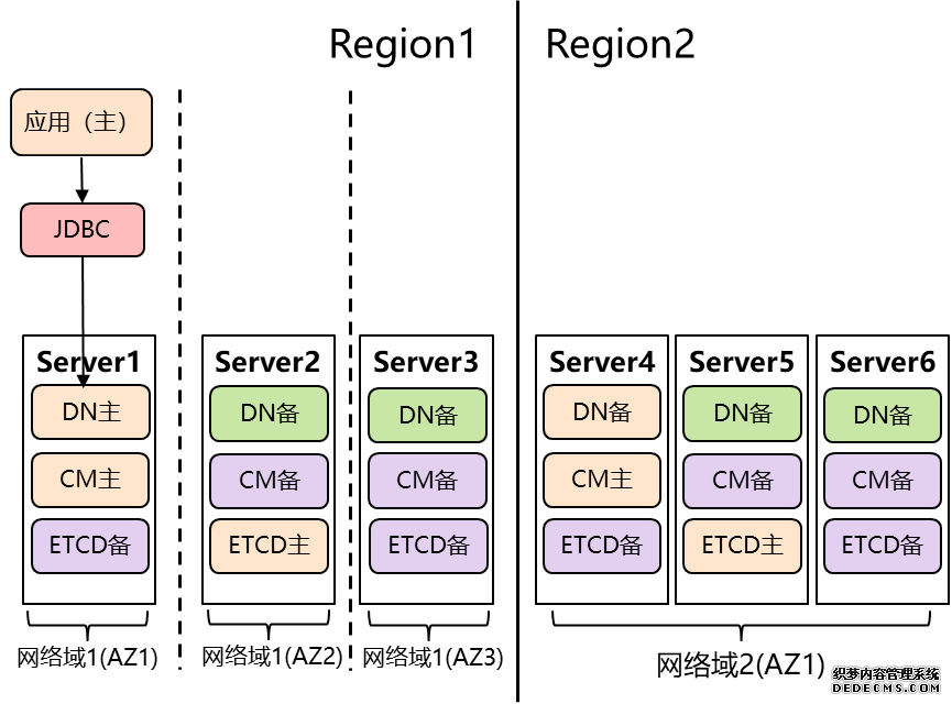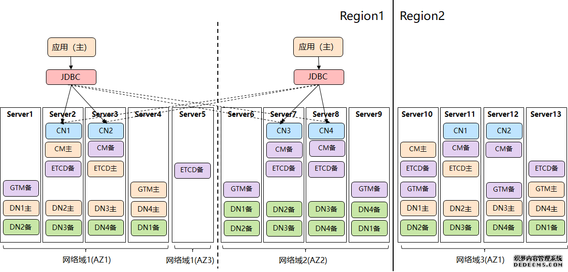 GaussDB 两地三中心高可用部署 2)同城 3AZ 高可用+异地容灾。 同城采用逻辑 3AZ、3 副本部署,异地采用单 AZ、3 副本部署,提供了同城抵御节点级故障和 AZ 级故障的能力,跨城的 Region 级容灾的能力。