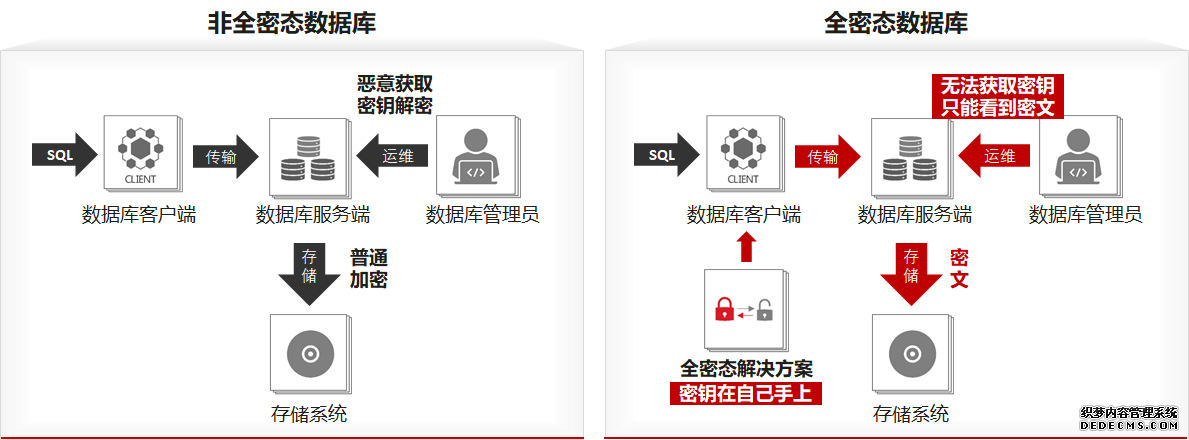 分布式数据库的挑战和关键技术 GaussDB 分布式数据库研发了一系列高性能、高可用、安全特性迎接上述四大挑战,下面挑选几个有代表性的特性加以说明。 全密态传统的加密方式在服务端加密,密钥管理员是可以获取的。而全密态数据库的密钥掌握在用户自己手上,数据库管理员无法获取,加解密过程仅在客户侧完成,数据在存储、传输、查询整个生命周期过程中均以密文形态存在,避免管理员恶意获取密钥解密数据。