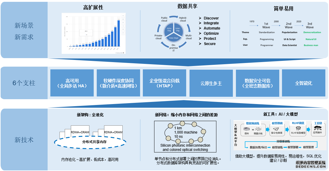 GaussDB 同城 3AZ 高可用+异地容灾 分布式数据库技术的发展方向基于新需求、新场景、以及全池化架构、新网络和大模型等新技术的出现,我们认为分布式数据库技术主要向以下六个方向发展。