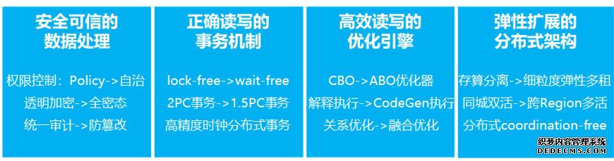 分布式数据库技术的发展方向 高可用能力的持续提升高可用是目前大多数金融政企客户首要关注的问题,特别是对于多地、多中心容灾有要求的客户。针对这样的客户,华为云 GaussDB 已经提供了多种解决方案,如支持同城双活、异地容灾、两地三中心的解决方案,支持同城双活强同步的解决方案,支持异步数据复制、多地多活的高可用解决方案。 面向未来,分布式数据库将具备真正全球部署能力的多活架构。 软硬件深度协同硬件和软件两者之间相辅相成,互相促进。利用新型硬件(GPU、FPGA、高速网络)和华为在芯片、服务器、存储、网络、操作系统、数据库的全栈软硬件能力,提升性能和高可用能力。 首先,数据库的持久化逻辑,深度整合到了计算与存储分离的技术底座中,分布式数据库可以获得在容量、弹性、扩展性方面的巨大提升,同时能提供给客户一致的体验。 其次,从计算节点卸载下推到存储中,特别是对一些复杂的查询处理,同时叠加并行处理能力,使得这些计算逻辑能充分利用下面整个存储池的能力,同时最关键的是能做到对业务透明。 最后,就是高性能。高性能的实现除了 I/O 聚合之外,单条交易的本质就是网络的时延和处理的时延。所以,网络对于分布式数据库的时延(性能)影响是巨大的。 总而言之,软硬协同带给我们的不仅仅是性能扩展方面的优势,更是可以通过软硬协同打造真正企业级的可靠性。 企业级混合负载 (HTAP)近年来企业级混合负载(HTAP)的兴起,旨在打破事务处理(TP)和分析(AP)之间的壁垒。分布式数据库都应具备混合负载能力,即在支持高并发、事务性请求的同时,对分析型的复杂查询提供了良好的支持,从而大幅度降低成本,同时提高企业决策的效率。 HTAP 架构的核心技术: 第一,透明路由。通过自动选择行存引擎、列存引擎以及行列组合,提供查询的准确性和实时性,增加客户的易用性,提升 HTAP 产品的商用价值。 第二,性能提升。TP 要求的是低时延、高吞吐,而 AP 要求的是复杂查询的能力。常规执行优化技术包括并行执行、编译执行、向量化执行等,在这些技术的基础上进一步加速复杂查询,支撑企业级混合负载。 第三,数据新鲜度。保证数据高新鲜度、高性能,保证 HTAP 架构能够具备更多应对用户的能力。 第四,资源隔离。用户对 TP 性能要求比较高,在引入实时 AP 的同时,不能影响 TP 的能力和性能,需要在资源隔离、数据新鲜度以及性能的提升方面做好权衡。 云原生多主单一架构其实并不能解决今天行业碰到的所有问题,但云原生多主架构可以帮助解决两类问题: 第一个,是高可用的问题,希望能基于多主架构,解决切换时业务中断的问题。 第二个,是扩展性的问题,基于多主架构,融合软硬协同的进展,真正能在计算节点以下,持续提升产品的性能和弹性。 数据安全可信当今世界,每个国家、组织和个人都在关注安全、合规和隐私的问题,几年前数据无保护随意获取并使用的便利不再,这也促进了技术的进步和落地。未来,全行业都会面临越来越严格的对于可信安全方面的要求。 全密态是华为云数据库为了提升隐私保护能力研制的一项关键技术,全密态支持数据在整个计算过程中同样是以密文形式存在,实现了让整个敏感数据在全生命周期当中都得到保护。因此,无论数据处于何种状态,攻击者都无法获取到有效信息,从而保障了企业数据全生命周期的隐私安全。 AI-Native机器学习已被广泛用于优化数据管理问题,如数据清理、数据分析、查询重写、数据库诊断等。然而,传统的机器学习算法无法解决泛化和推理问题。幸运的是,大模型(LLM)可以帮助解决这些限制,为智能化数据管理提供了很好的机会。 借助 AI/LLM,未来分布式数据库将朝着全流程、全链路、高效易用的智能化数据库的方向发展,在数据库咨询、开发、运维等关键阶段,构建相应的自动化能力: 第一,咨询阶段,提供专家式辅助,制定精细化方案。