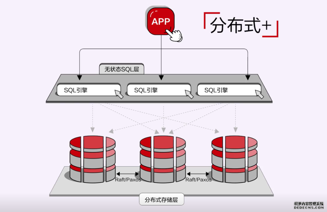 这条路线有限地解决了扩展性问题,数据一致性主要依赖分布式存储引擎。上层的计算节点无状态,共享存储提供跨节点读写。这种架构充分利用分布式存储提供的高级特性,更容易形成技术竞争力。但是这种架构的扩展性有限,尤其是写节点。 另外,这种架构对底座(分布式存储)有比较重的依赖,线下实现的成本高。 3. 原生分布式数据库。 这种形态是基于分布式数据库理论实现的分布式数据库。这条路线是根据分布式一致性协议做底层设计。原生分布式数据库将分布式存储、事务和计算结合在一起,数据由系统自动打散并存储多个副本,通过一致性协议保证多个副本和事务的一致性。