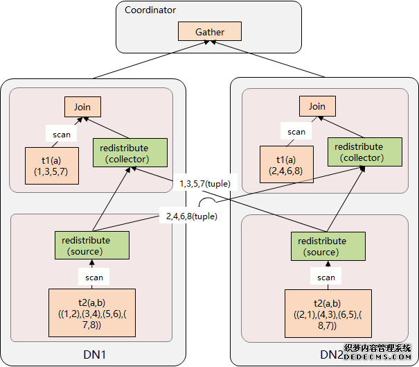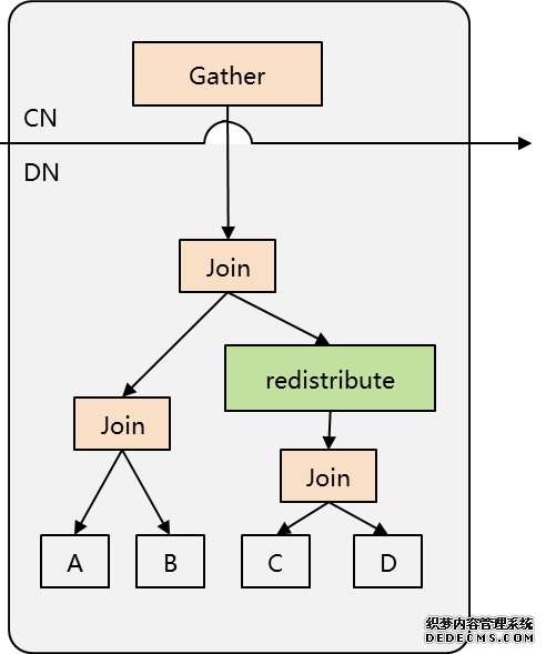 SQL 执行逻辑 以两个 DN 为例, 在执行过程中,DN 会按照 redistribute 键将数据发送到对应的节点。 Redistribute 算子接收到 C/D 两表 join 的数据之后,根据重分布键计算将数据发给 DN1 还是 DN2,Redistribute Collector 收集到重分布之后的数据之后发给上层的 Join 算子再做 Join 计算。