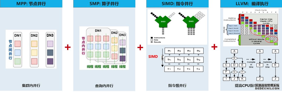 CN、DN 间的数据流动 另外,GaussDB 的优化器会根据统计信息选取针对当前 SQL 性能最优的 Stream 流算子完成 CN、DN 间的数据流动。 2. 全并行架构 GaussDB 采用全并行架构,从 MPP 节点并行、SMP 线程并行、到 SIMD 指令并行,到 LLVM CodeGen 技术,全面挖掘系统计算资源的潜力,提升查询性能。