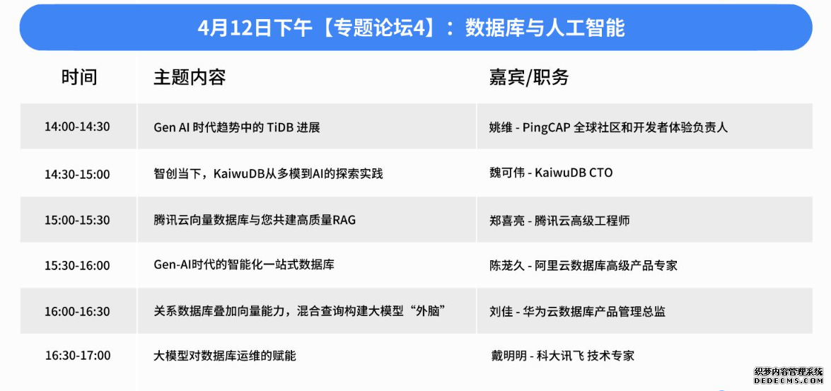 这些演讲嘉宾都是在数据库一体化领域有着丰富经验和深入研究的专家。他们的演讲将为参会者提供关于数据库一体化的最新实践和创新技术的深刻见解,帮助参会者了解如何通过一体化策略来提升数据库系统的整体性能和用户体验。通过这些专家的分享,参会者将能够获得宝贵的行业知识,为自己的技术发展和企业创新找到新的方向。 专题论坛 4:数据库与人工智能在 AI 技术飞跃发展的当下,数据库也从中获益,借助 AI 能力实现数据库系统的自调优、自诊断、自安全、自运维、自愈,基于大模型的 NL2SQL、专业知识库也在改变着数据库的基础架构。同时库内 AI、多模等数据库技术也在加速人工智能的应用发展。