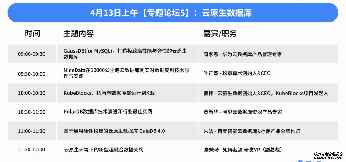 这些演讲嘉宾都是在数据库与人工智能结合领域的先驱和实践者。他们的演讲将为参会者提供关于 AI 在数据库领域应用的深入见解,包括最新技术趋势、实践案例和未来发展方向。通过这些专家的分享,参会者将能够了解如何利用 AI 技术来提升数据库的智能化水平,为自己的技术发展和企业创新找到新的思路和方法。 专题论坛 5:云原生数据库随着云计算时代的到来,灵活、实用、池化、弹性且安全可靠的云原生数据库解决方案也成为主流趋势。通过在公有云、私有云、混合云等平台上构建、部署和交付整套数据库服务,从而降低用户技术门槛、减少维护成本、提升用户体验、节省资源费用。