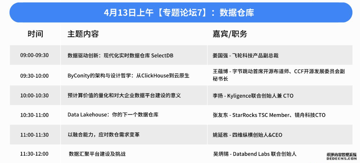 这些演讲嘉宾都是在数据库极致特性开发和应用领域有着丰富经验和深入研究的专家。他们的演讲将为参会者提供关于数据库高级特性的最新技术趋势、实践案例和未来发展方向的深入见解。通过这些专家的分享,参会者将能够了解如何利用技术创新来提升数据库的性能和功能,为自己的技术发展和企业创新找到新的思路和方法。 专题论坛 7:数据仓库数据仓库技术一直是企业数据管理的核心,面对日益增长的数据量和多样化的数据类型,数据仓库技术也在不断创新和升级。本专题将聚焦于实时数仓、数据湖和湖仓一体等核心概念,探讨数据仓库在现代数据架构中的角色与挑战。