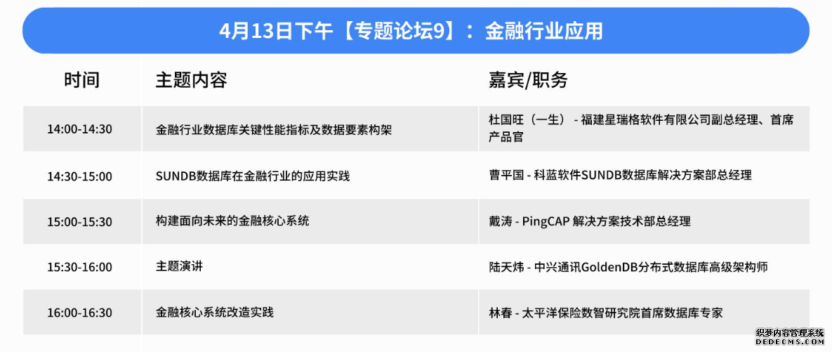 这些演讲嘉宾都是在数据库生态软件领域有着丰富经验和深入研究的专家。他们的演讲将为参会者提供关于数据库生态软件的最新技术趋势、实践案例和未来发展方向的深入见解。通过这些专家的分享,参会者将能够了解如何利用生态软件来提升数据库的运维效率和数据安全性,为自己的技术发展和企业创新找到新的思路和方法。 专题论坛 9:金融行业应用金融行业因其独特的社会功能,对数据库的稳定性、安全性、一致性和运行效率都有至高要求。面对复杂的业务场景与严苛要求,数据库技术该如何创新及落地,保障业务系统稳定、高效和安全的运行?本专场将深入研究数据库在金融领域复杂且高标准要求下的最佳实践。