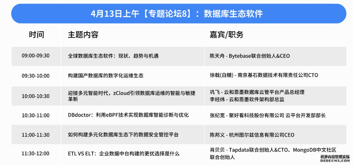 这些演讲嘉宾都是在数据仓库领域有着丰富经验和深入研究的专家。他们的演讲将为参会者提供关于数据仓库的最新技术趋势、架构设计和实际应用的深入见解。通过这些专家的分享,参会者将能够了解如何利用现代数据仓库技术来提升企业的数据管理和分析能力,为自己的技术发展和企业创新找到新的思路和方法。 专题论坛 8:数据库生态软件生态软件作为数据库应用的重要组成部分,涵盖中间件、操作系统、迁移备份、开发平台、监控管理等多个方面。本专题将聚焦生态软件的发展趋势和创新应用,为您带来最新的生态软件技术动态和实践案例。