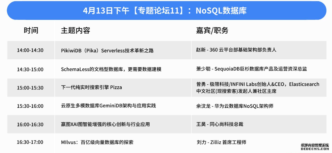 这些演讲嘉宾都是在数据库新技术领域有着丰富经验和深入研究的专家。他们的演讲将为参会者提供关于最新数据库技术趋势、产品能力和实践经验的深入见解。通过这些专家的分享,参会者将能够了解如何利用新技术来提升数据库系统的性能和智能化水平,为自己的技术发展和企业创新找到新的思路和方法。 专题论坛 11:NoSQL 数据库为了解决大数据及大模型场景中海量、多源和多格式的数据处理问题,向量、时序、图、搜索等 NoSQL 数据库方案在近几年取得飞速成长,也受到越来越多的关注。本专题将深度剖析各类 NoSQL 数据库的特点和适用场景,带您探寻 NoSQL 数据库的创新技术和实际应用。