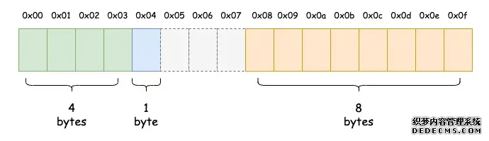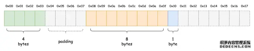 - 字段 B 8 字节:下标 4-7,对 8 都不能整除,则填充空白,下标 8 可以整除,所以下标 8-15 8 个字节为字段 B 的存储使用;